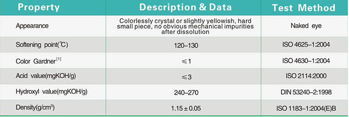 Dissolved into solvents to prepare the 50% resin solution, and then added it into coatings/oil ink formulas approp-riately. Recommended adding percentage is 5-30% of the formula’s total mass.